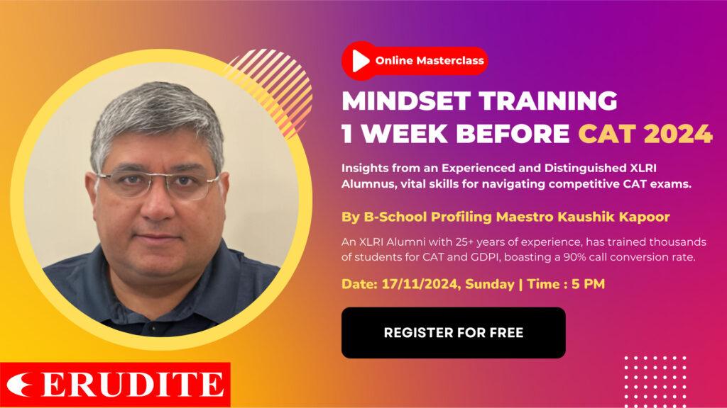 Join Mr. Kaushik Kapoor, An esteemed XLRI Alumnus and renowned profiling expert, for an exclusive, high-impact session on mastering mental preparation for the CAT exam! Discover powerful, proven strategies to conquer stress, sharpen focus, unlock peak performance, and achieve your personal best on CAT day. Don’t miss this opportunity to gain insights from an industry expert and elevate your CAT preparation to the next level!